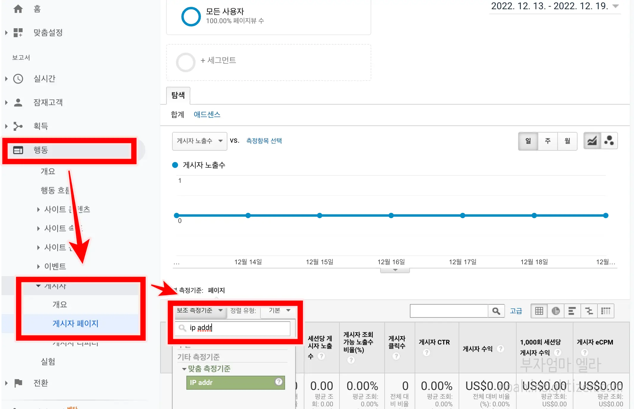 그리고 '보조 측정기준'에서 IP ADDR을 검색하면, 화면에 수치가 나타나요. 페이지뷰 수, 클릭률, CTR 등 각 IP주소 별 내용을 확인할 수 있어요.